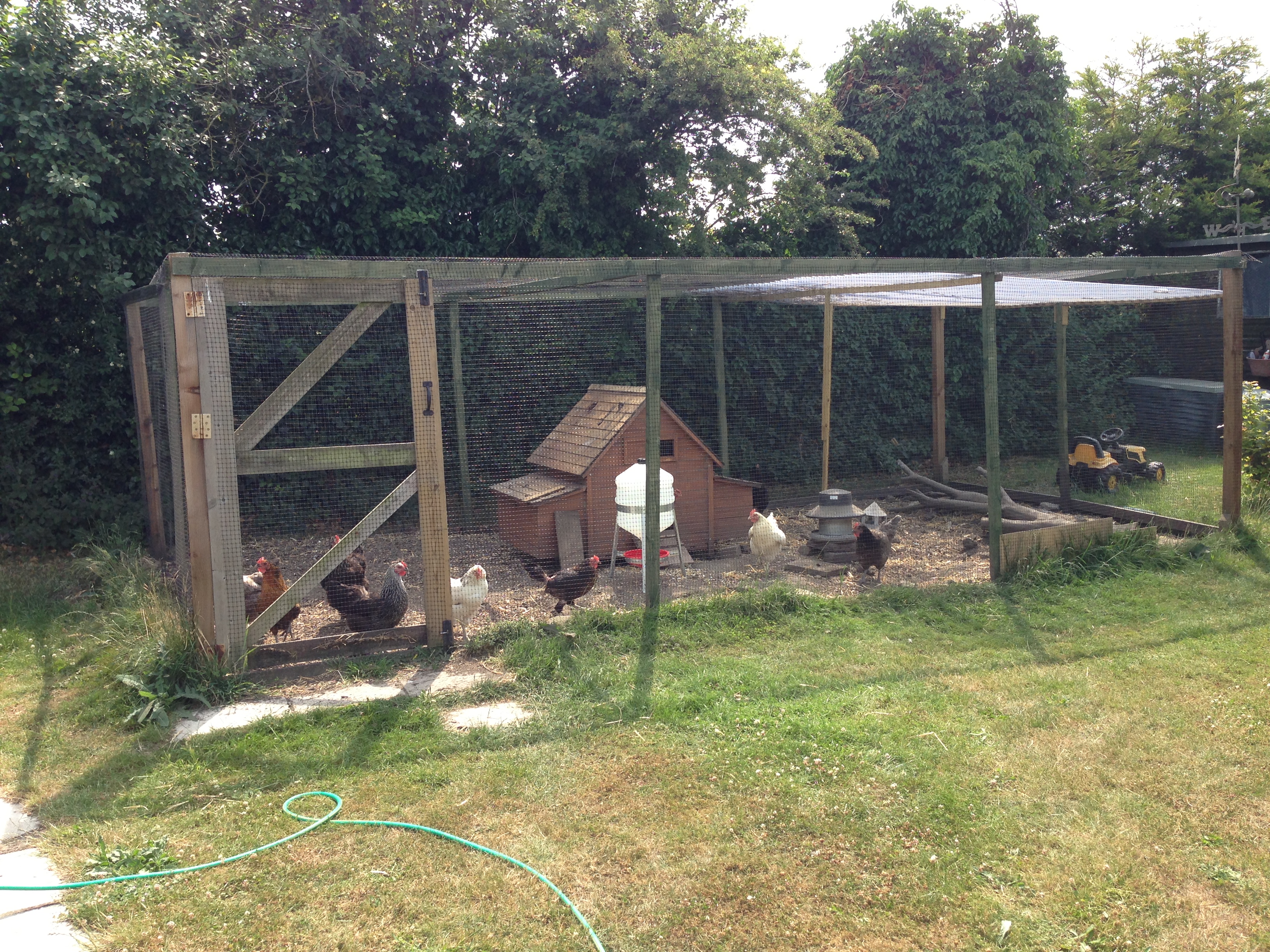 On average we get about 6-8 eggs a day, which our friends and family love because, as I said, fresh eggs taste great! In Winter that does drop a bit and we’ve noticed in the last couple of weeks that they are not laying as many eggs which we’re putting down to the heat wave we currently have here in the UK. Mainly the hens do lay their eggs in the nesting boxes but often we find them in the house and once in a while we find one on the ground in the run itself. I think that may have been partly because we introduced five hens in two weeks. We adopted two fully grown ones from a friend of mine (who couldn’t believe how big the run was) and we brought three young ones from the gentleman who we get our hens from. This meant there was a lot of pecking order squabbles going on. Those have all but ended now, we still have still have squabbles but nothing of note.