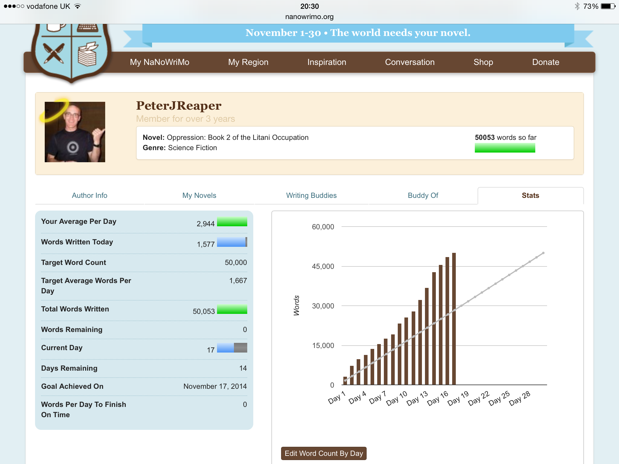 I wrote 1727 words today, for a total of 50203. That obviously passes the magical 50k words! 😀 Yes I did punch the air, a few times since passing that 50k. I do believe that you don’t have to write 50,000 words in a month to Win NaNoWriMo, as you get a start then you have something you can build from.