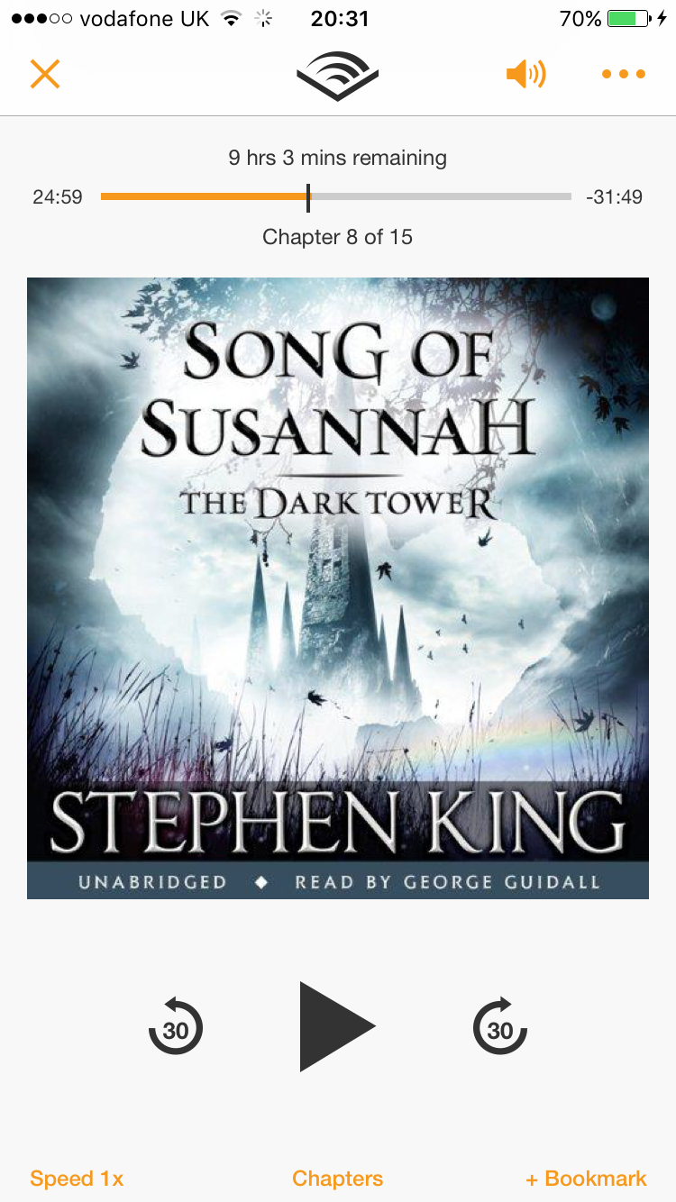 And finally, the audiobook I’m listening to is Song Of Susannah: The Dark Tower Book Six by Stephen King and read by George Guidall. This is a series which is taking some fascinating turns and I’m trying to power through quickly so I can get to the end and see how it all wraps up.