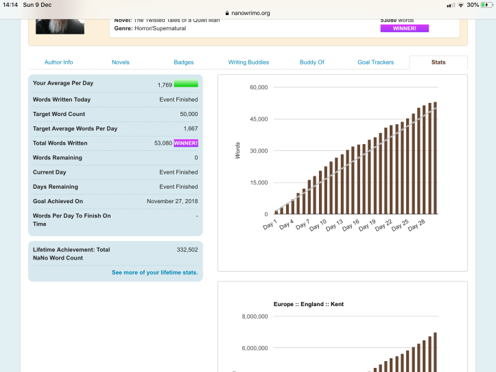Another goal I had was to be more proactive in my local NaNo region. I wanted to host write-ins, I wanted to be positive and supportive of the Kent NaNoWriMo community. They’ve been so good to me in the eight years I’ve been a member of the group, especially the previous five years where I’ve been active in the group. This year I really wanted to step up. I think I hosted nine write-ins, actually I think it was ten in the end. I tried to be helpful and encouraging in the Facebook group. I needed to do more on the actual NaNo website itself, but that I’ll do next year.