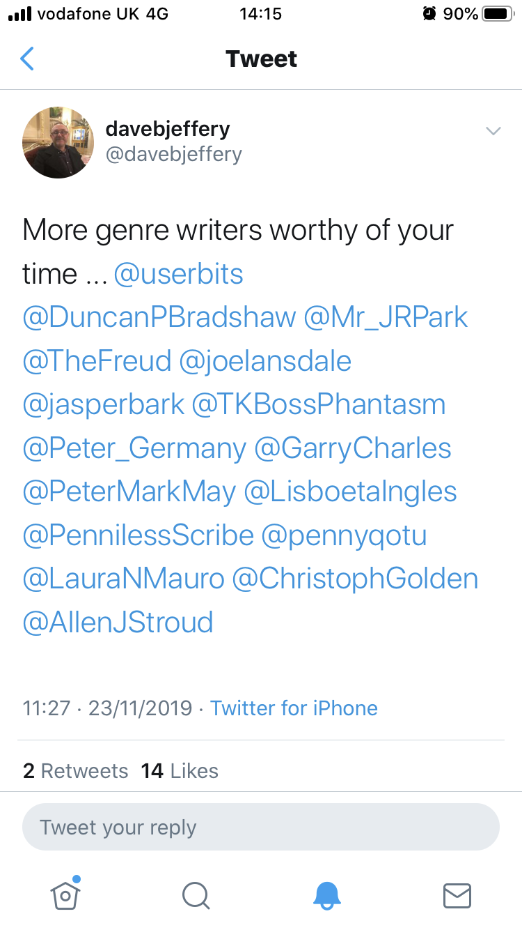 Then, one random day Dave B Jeffrey tagged me on Twitter as a genre writer worthy of peoples time. I think I was already coming out of my pit of self-loafing but this yanked me out. Without knowing it Dave Jeffrey threw a rope down that deep dark hole I was trying to claw my way out of and pulled me out. I only know Dave Jeffrey on social media. He seems like a nice guy but as someone with a touch of shyness and a lot of social anxiety I’ve not really spoken to him. So this was a big surprise.