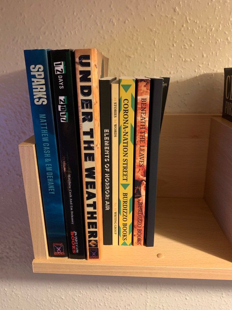 1. 836 is great. I got in about 700 first thing this morning. I want to get in 400 before dinner, fingers crossed. I dig your vanity shelf. I don’t have one. (Then again, I’m only published in one anthology, so I’m not sure it’s worth a whole shelf.)