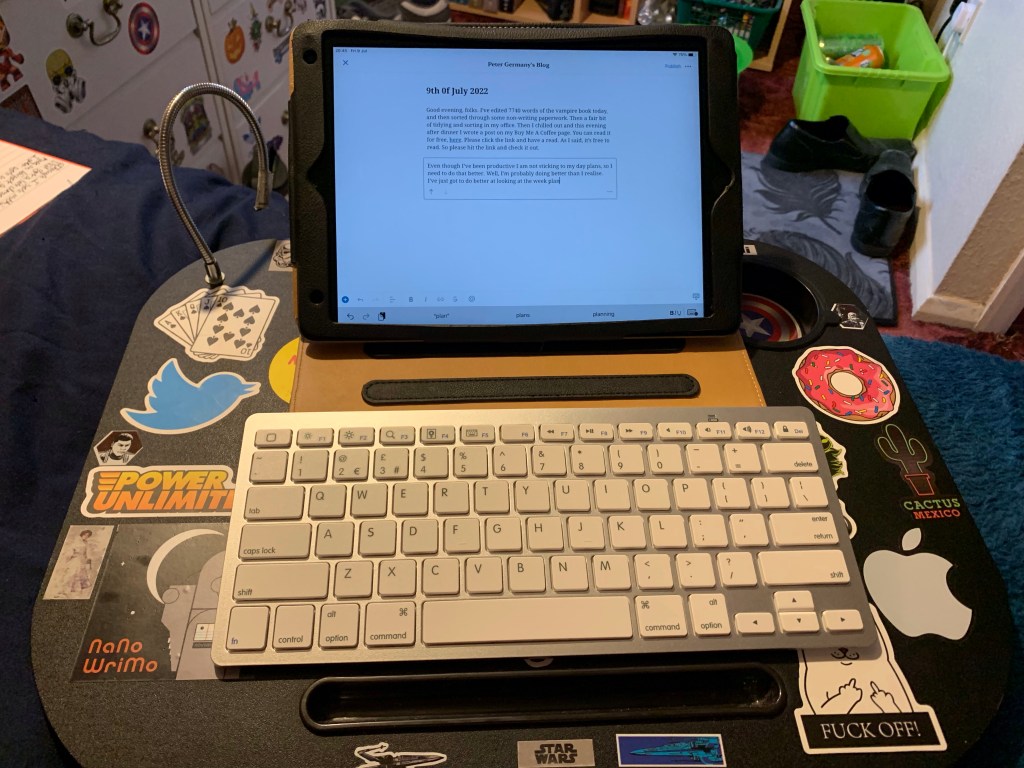 Good evening, folks. I’ve edited 7740 words of the vampire book today, and then sorted through some non-writing paperwork. Then a fair bit of tidying and sorting in my office. Then I chilled out and this evening after dinner I wrote a post on my Buy Me A Coffee page. You can read it for free, here. Please click the link and have a read. As I said, it’s free to read. So please hit the link and check it out.