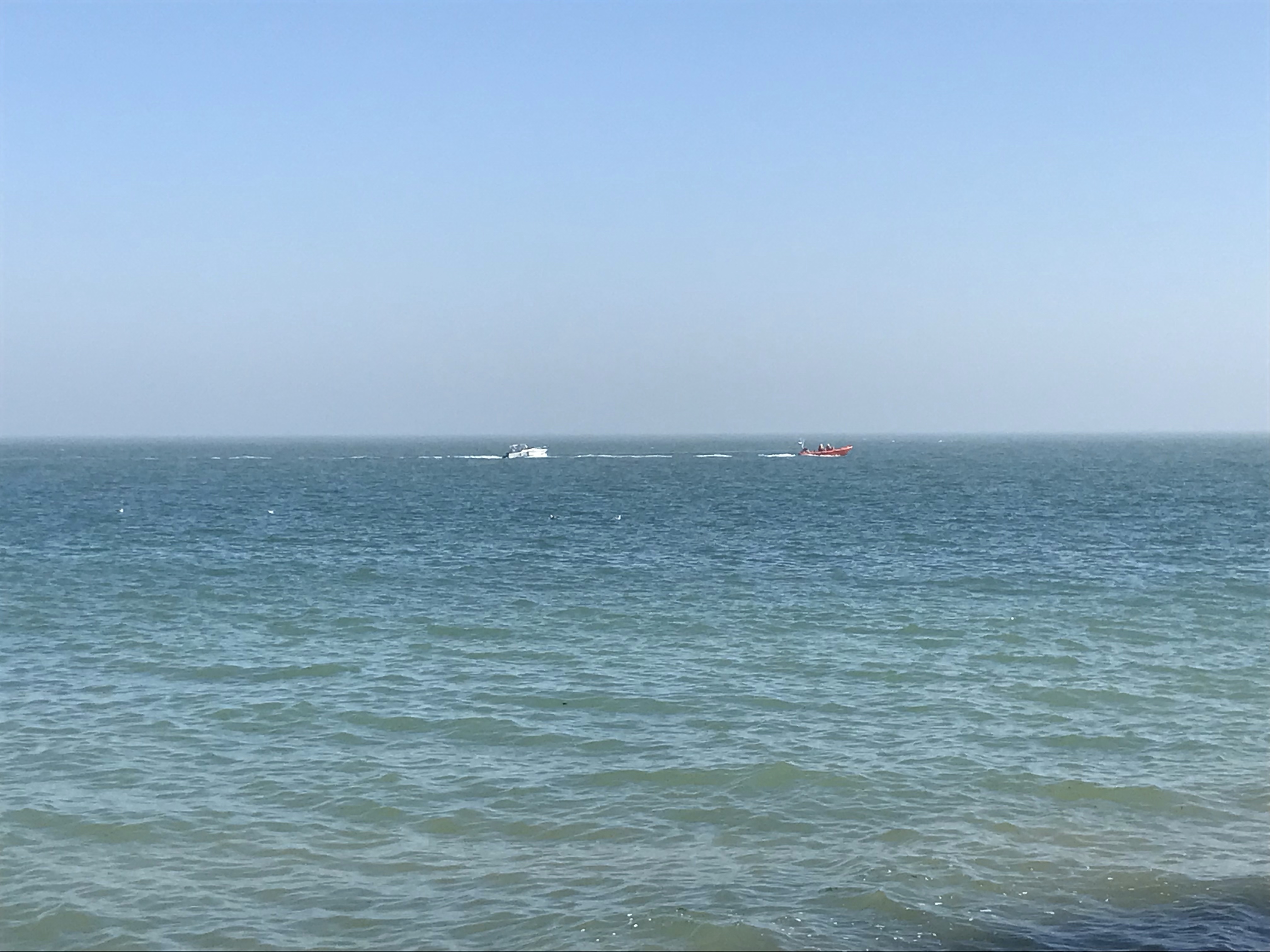 This time down here I look at the haze on the horizon and can just see darker shapes. Is this France? or boats.